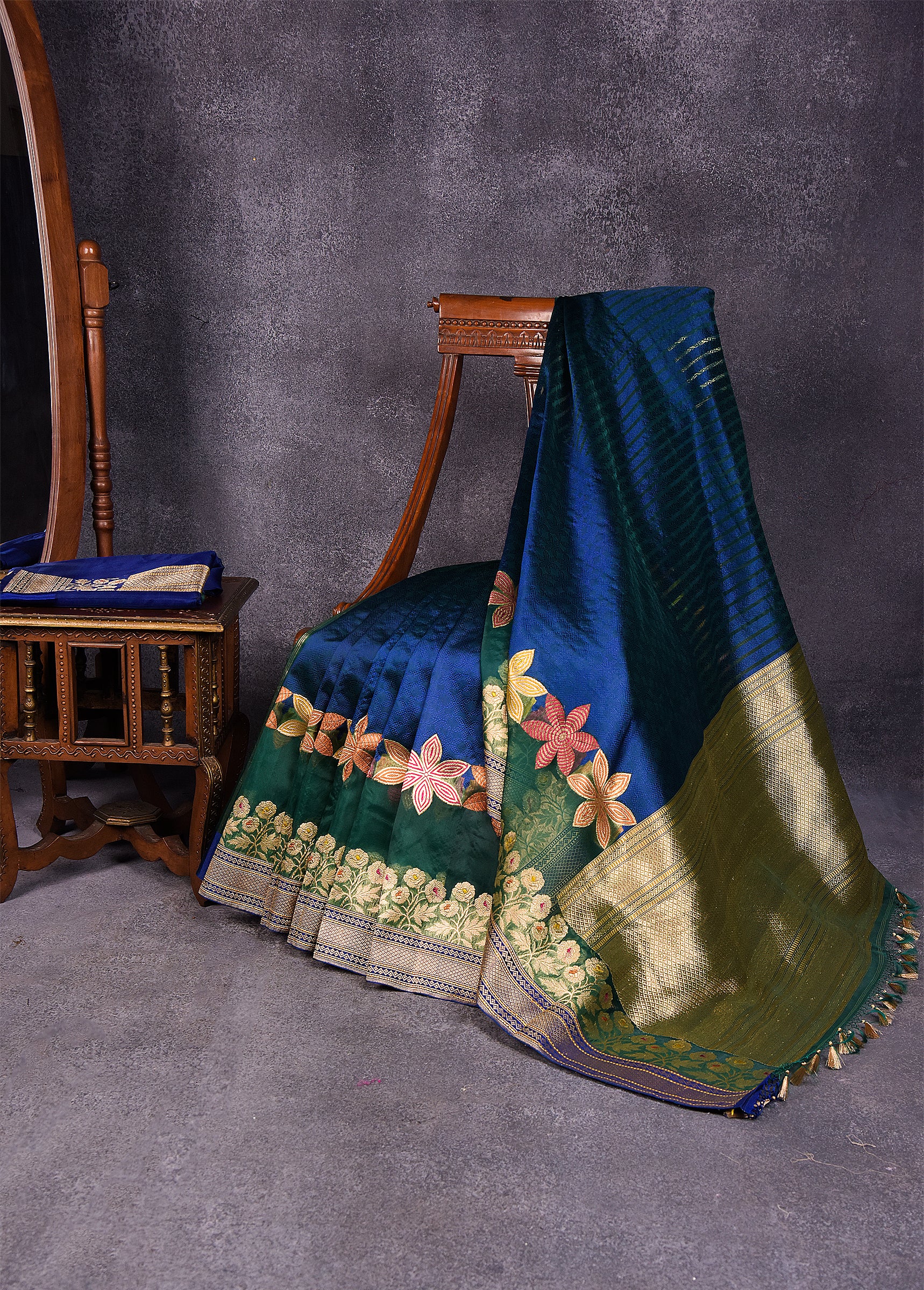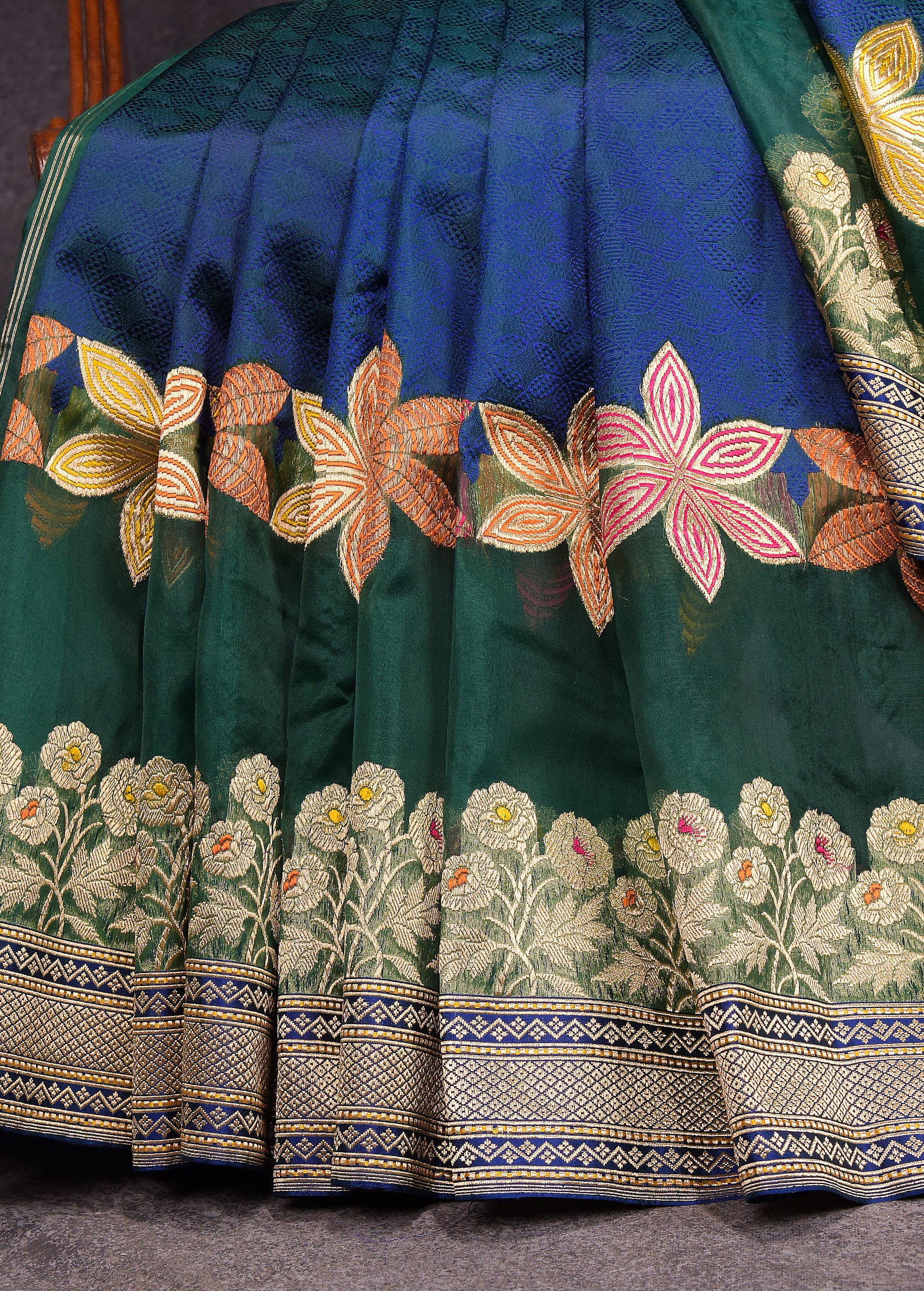 Peacock Blue Green Pure Silk Kora Banarasi Saree
