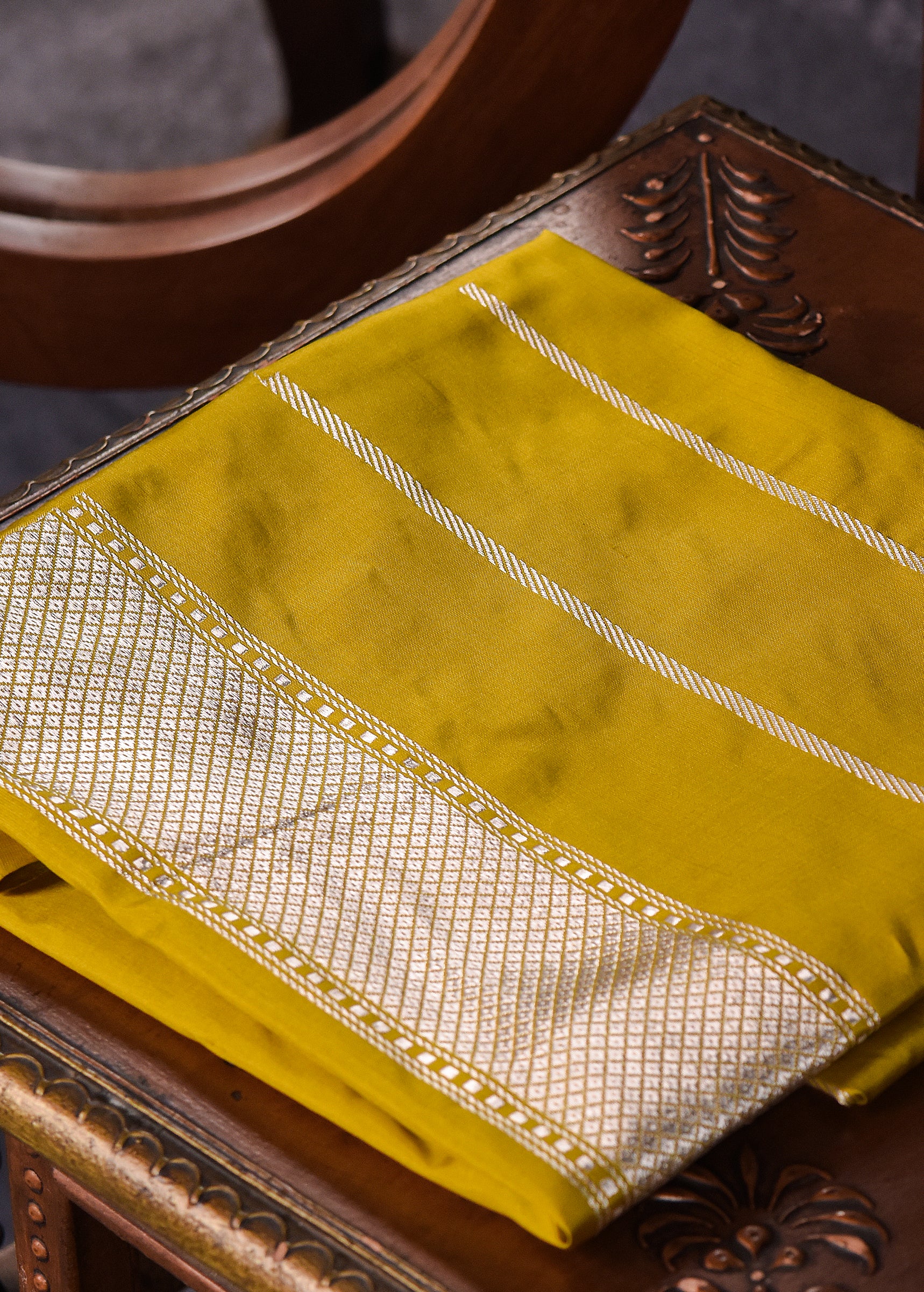 A pure silk Katan Banarasi, exquisitely woven in elegant Kadwa technique, featuring silver zari and subtle meenakari accents on the skirt, embodying timeless sophistication throughout