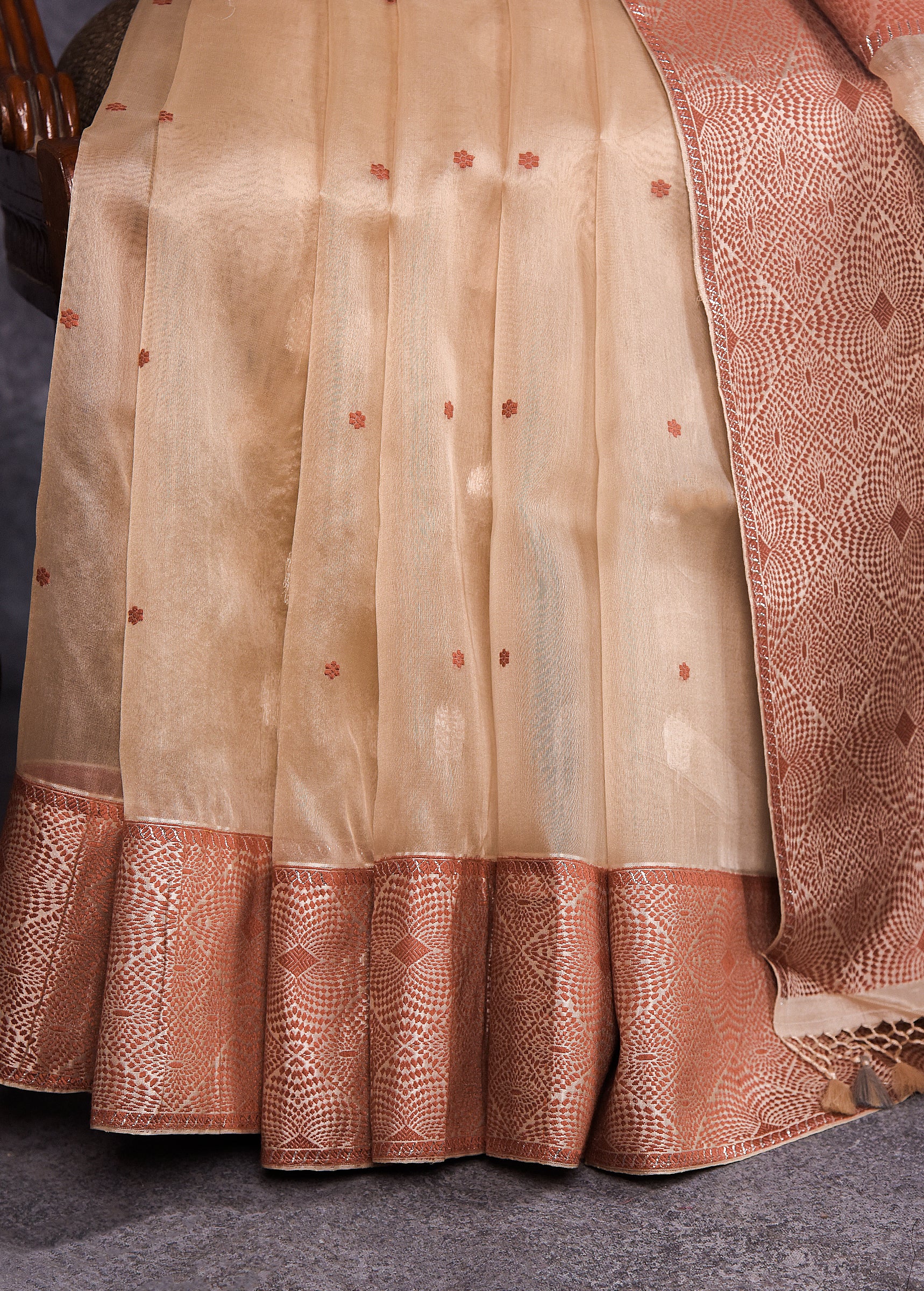 Golden Beige with Earthy Brown Pure Silk Kora Banarasi Saree