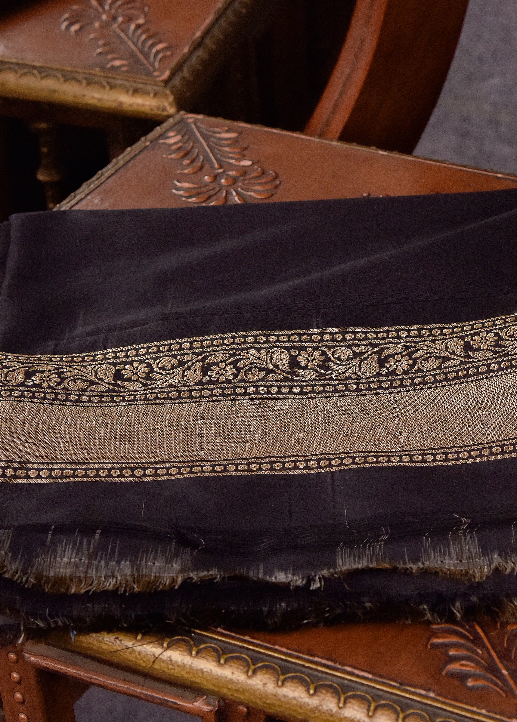 In classic black pure silk Katan, this kadhwa-woven marvel is a tribute to vintage Banarasi artistry — with silver and gold zari interwoven into intricate meenakari, and a lavishly adorned skirt that echoes royal grandeur and tradition.