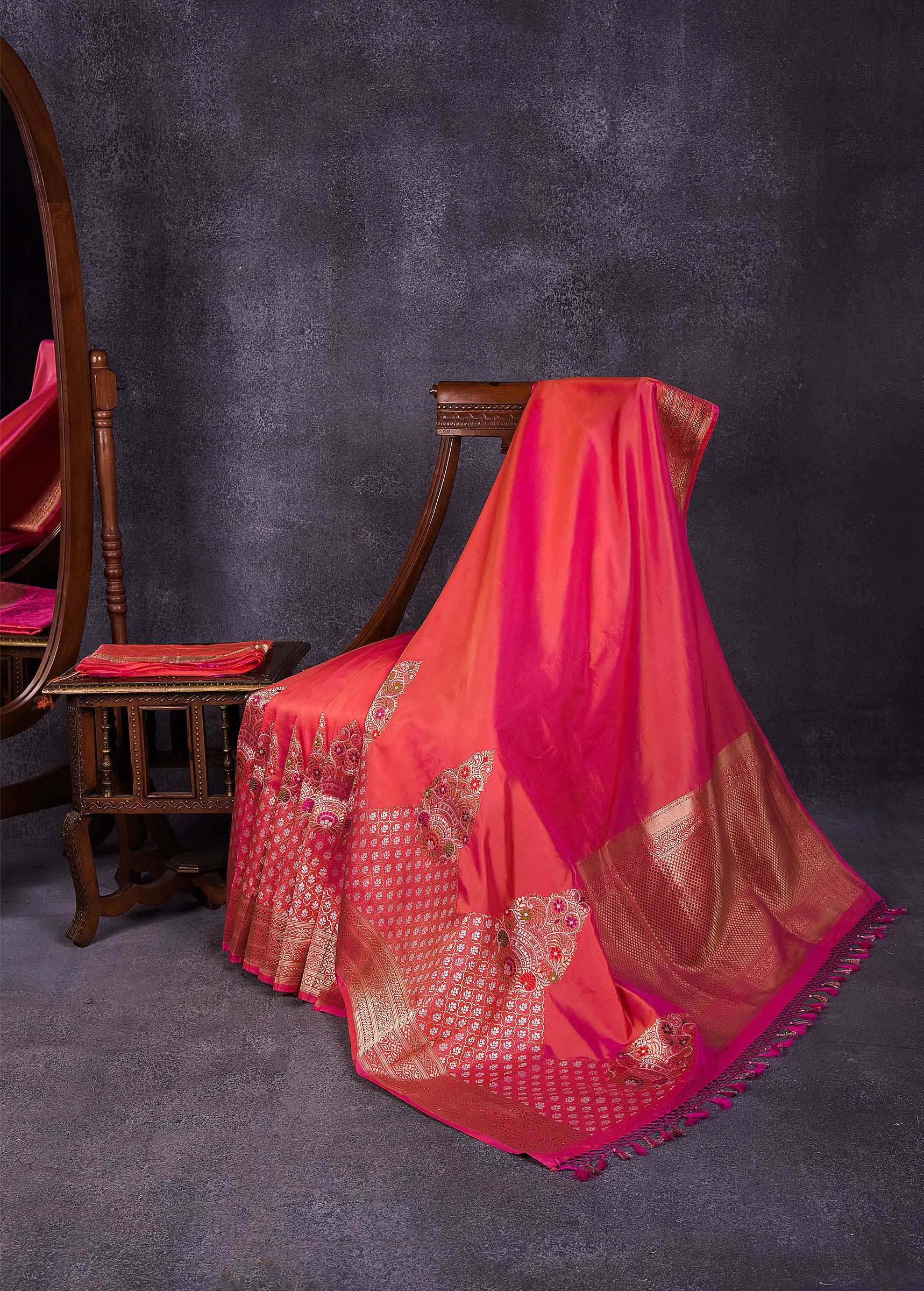 Pure Silk Katan Banarasi with intricate meenakari detailing on the skirt, woven in both silver and gold zari, enriched with vibrant festive hues, and a body in a radiant shot-peach tone