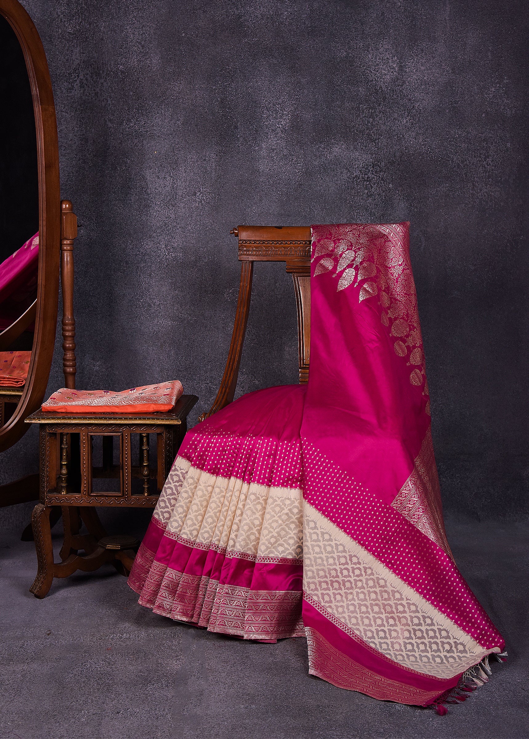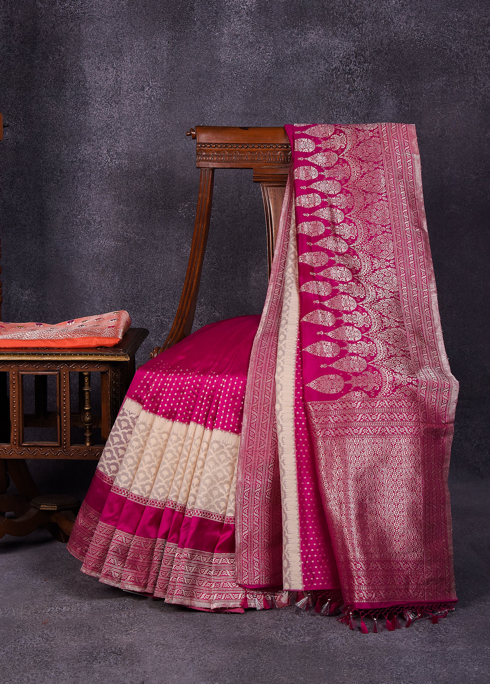 A masterpiece of pure silk Katan Banarasi, where intricate silver zari artistry gracefully crowns the top and bottom borders, harmoniously paired with a delicate Jamdani-style Kora Banarasi skirt—this saree weaves together contemporary elegance and timeless tradition in perfect balance