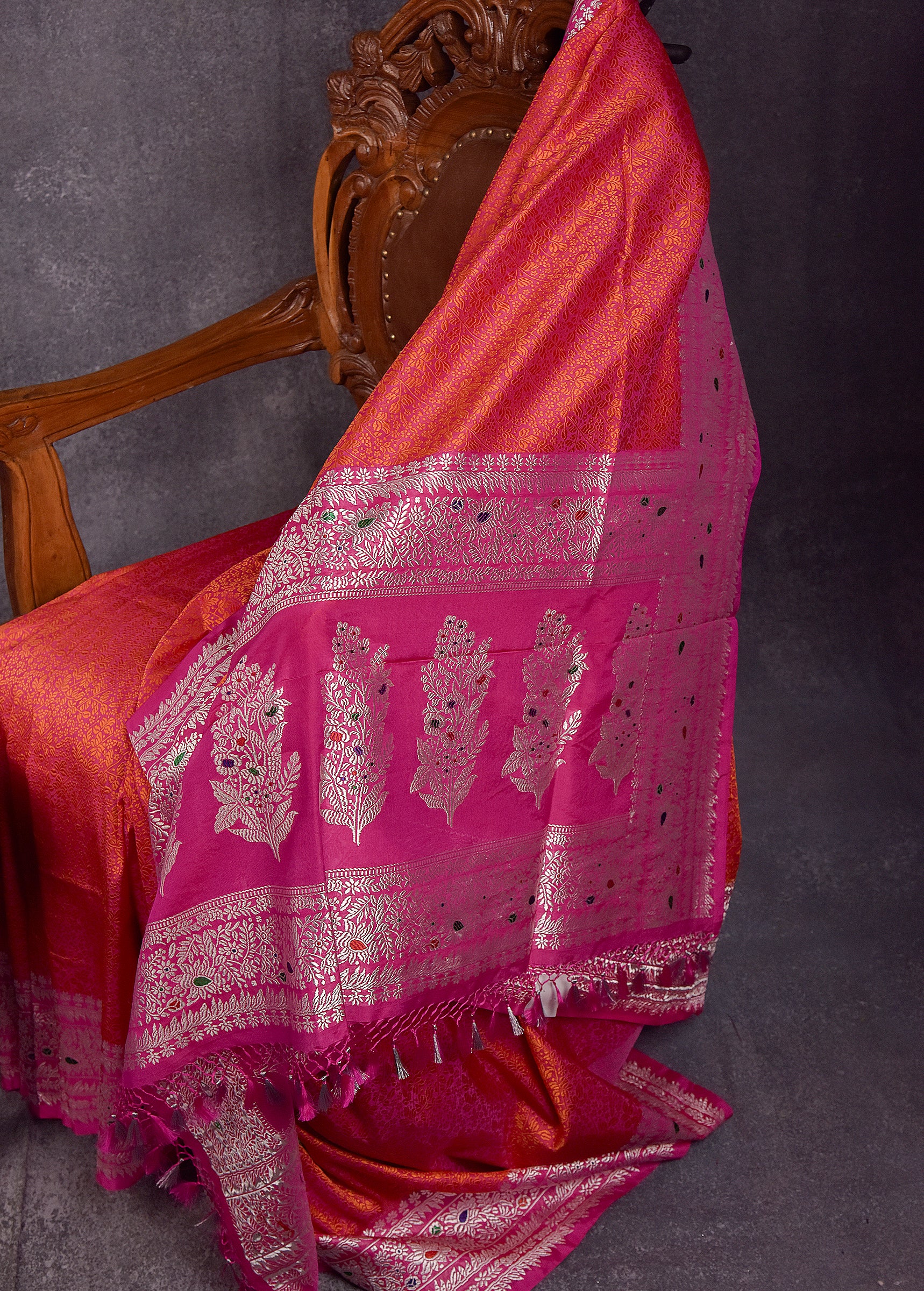 A vibrant no-zari pure silk Katan Banarasi, featuring intricate threadwork brocade across the body and adorned with meenakari highlights on the palla and borders, in a lush medley of orange and hot pink.